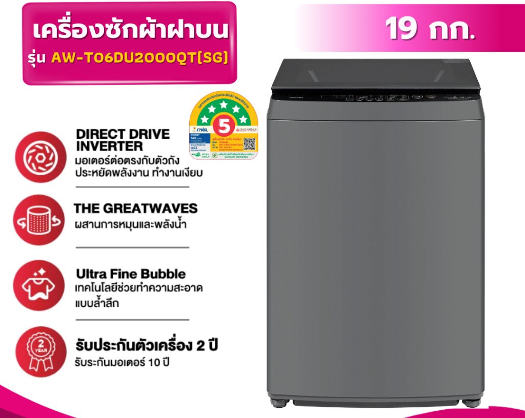 เครื่องซักผ้าฝาบนTOSHIBA AW-T06DU2000QT(SG) 19 กก. อินเวอร์เตอร์ สีเงิน