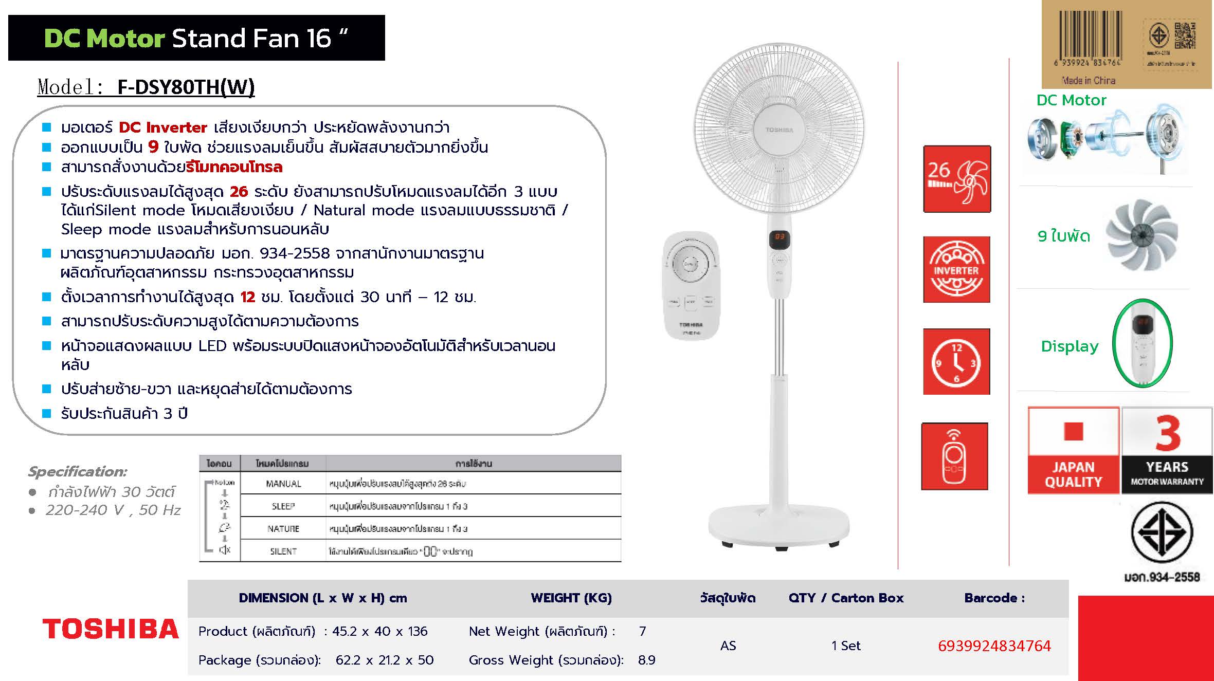 - มอเตอร์แบบ Inverter ประหยัดพลังงาน ทนทาน ทำงานเงียบ